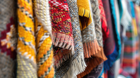 A vibrant artisan market scene featuring colorful handcrafted textiles, intricate patterns, and cozy baskets filled with yarn, creating a unique cultural atmosphere.