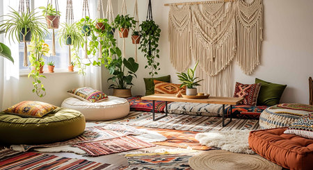 A bohemian-style lounge area with macramé wall hangings, colorful cushions, and low wooden seating, created by ai