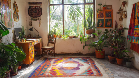 Natural light fills a cheerful workspace adorned with plants, vibrant textiles, and rustic furniture. A desk beside a wide window creates an inviting environment for creativity.