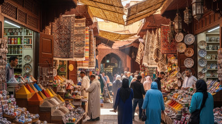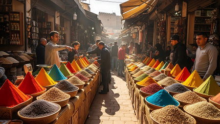 A vibrant and busy Moroccan market scene, showcasing an array of colorful spices, dried fruits, and nuts piled high on stalls, with people browsing in the background.