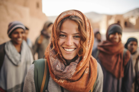 A joyful woman 45 years old from Afghanistan displays a bright smile while wearing traditional clothing. She stands confidently, embodying a sense of peace in her rural community. Generative AI.