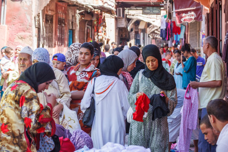 Marrakesh, Morocco - September 8th 2010: People in a busy street market. Street markets are held every day/