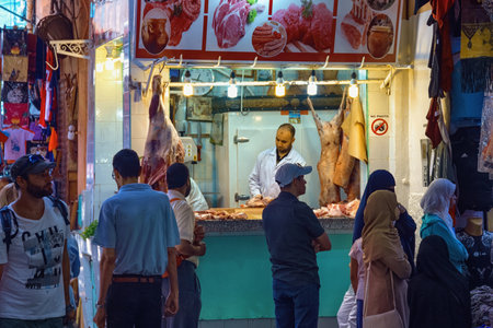 MARRAKESH, MOROCCO - JUNE 04, 2017: Meat sales at the market in the medina of Marrakesh.