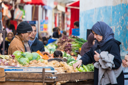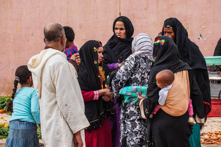OUARZAZATE/MOROCCO - APRIL 19 2017: People at a typical Moroccan market in the desert