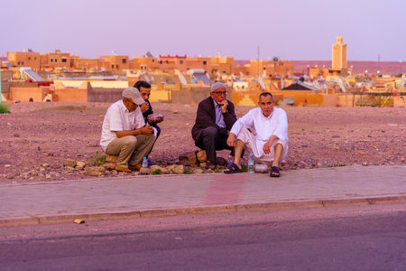Ouarzazate, Morocco - April 03, 2023: Sunset view of locals at the end of a Ramadan day, in Ouarzazate, Morocco