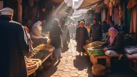 An image captures a lively market scene featuring a narrow alleyway lined with shops displaying diverse goods. The composition showcases architectural details, with buildings of warm colors. People dressed in traditional attire are seen walking. The photograph's lighting suggests daytime, perfect for various commercial applications.