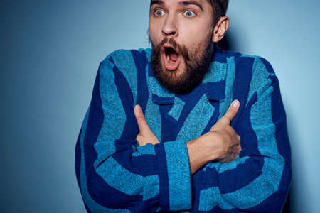 A man in a blue robe on a light background gestures with his hands model home clothes