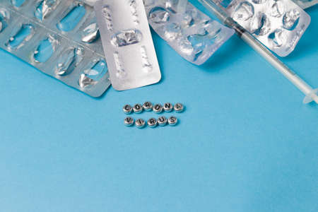 On white isolated background lie a syringe with medicine, a vial with a blue vaccine against viruses, pills for flu, colds. Medical preparations for the fight against the epidemic. Mock up, copy space