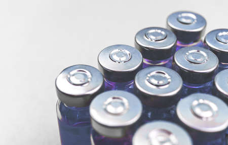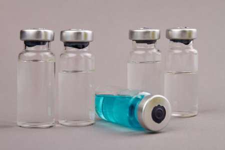 Glass medical ampoule vial for injection. Medicine is dry white drug penicillin powder or liquid with of aqueous solution in ampulla. Close up. Bottles ampule with aluminum cap on backgrounds gray.