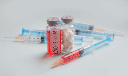 Covid-19 Corona Virus 2019-ncov vaccine vials medicine drug bottles. Vaccination, immunization, treatment to cure Covid 19 Corona Virus infection. Healthcare And Medical concept.