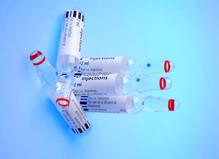 medicine concept, glass vial with medicine for injection saline dehydration rinsing close-up, blue background with copy space