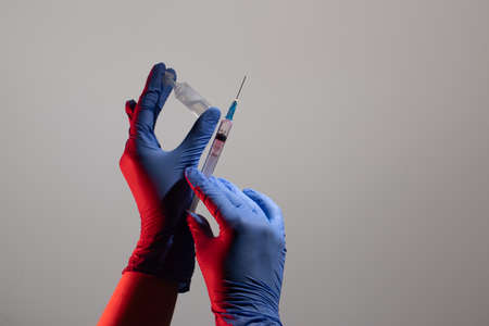 Doctor's hands are typing vaccine into a medical syringe from a glass ampoule on a black background in red light
