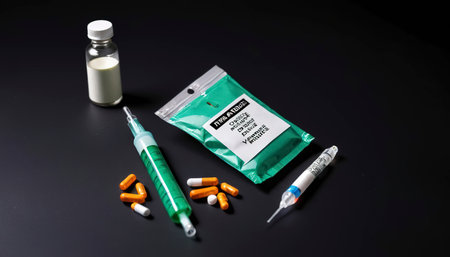 Addiction topic: ampoule with drug and syringe tablets lie on a dark background studio