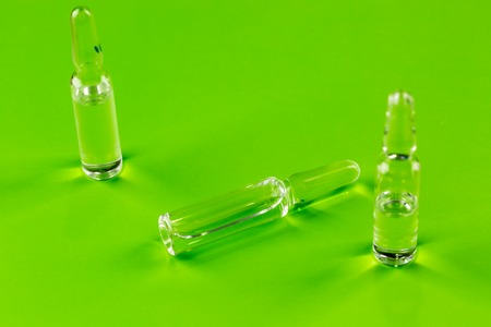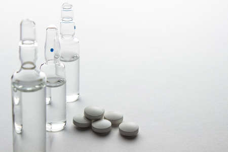 Ampoules with medicine lie on a light background. Vaccination. Pills or injections. The concept of medicine and immunity. Vaccination against viral infections. Copy space. Flatly