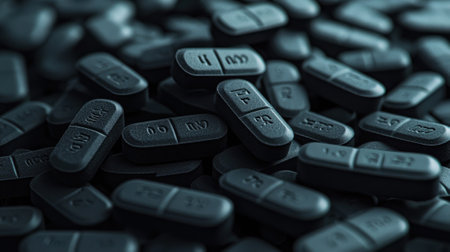 A large stack of black pills with numbers 1 through 10 on them. The pills are all the same size and shape, and they are piled on top of each other. The image gives off a sense of organization