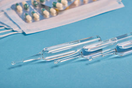 ampoules, blisters with pills and capsules and medical protective masks on a blue background copy space