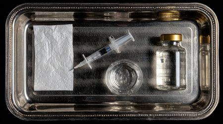 A detailed medical tray featuring a syringe, vial, glass, and cleaning paper, ideal for healthcare settings and treatment preparations.