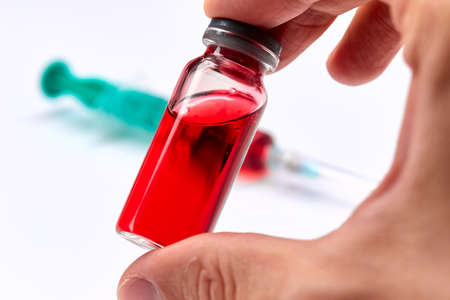 syringe and ampoule with red medicine on a dark background. Close-up. Horizontal orientation