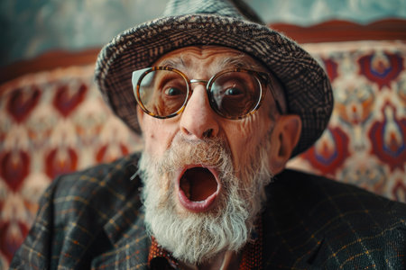 Portrait of an elderly man showing a shocked expression, wearing stylish retro eyewear