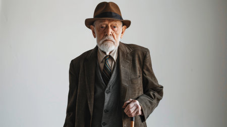 The image features a senior man posing in gray attire, set against a minimalist background with rounded shapes in light green, dark gray, and light brown. This subtle and balanced composition reflects a sense of calm and wisdom, blending the subject's poise with the simplicity and elegance of the background's color palette.