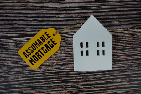 Assumable Mortgage text on price tag with white house model flat lay on wooden background