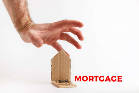 Bank investments and risks. A man's hand reaches for a mousetrap with a cardboard house, with the inscription MORTGAGE. Copy space.
