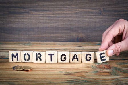 The word mortgage was created from wooden cubes. business and market. close up.