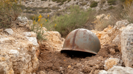 An evocative image of a historical military helmet partially buried in earthy soil, surrounded by rocky terrain and sparse vegetation, evoking themes of war and remembrance.