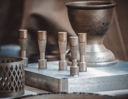 Object printed on metal 3d printer close-up. Object printed in laser sintering machine. Modern 3D printer printing from metal powder. Concept progressive additive DMLS, SLM, SLS 3d printing technology