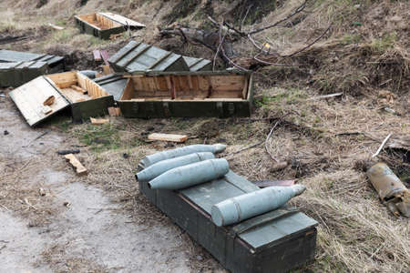 Unexploded mortar mines on ground. War actions aftermath.