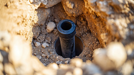 This image showcases a freshly installed pipe within a digging hole at a construction site, surrounded by dirt and rocks, highlighting essential infrastructure work.