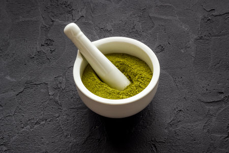 dried stevia leaves crushed in a mortar - natural sweetener, sugar substitute
