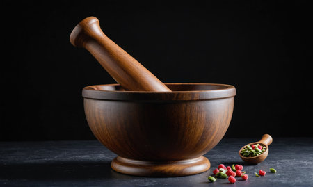 A wooden mortar and pestle rests on a dark countertop, ready for grinding spices