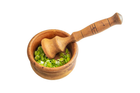 Fresh, green garlic leaves paste called mujdei in romanian cuisine, made in a wood pestle mortar, soft focus close up