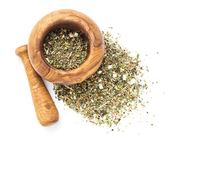 Herbal tea or dry herb in mortar and pestle, top view, on white background