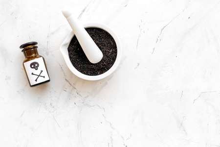 Prepare poison. Bottle with skull and crossbones near mortar and pounder on white stone background top view space for text