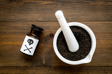 Bottle with skull and crossbones near mortar and pounder on dark wooden background