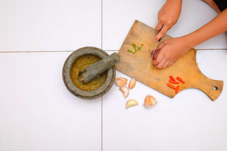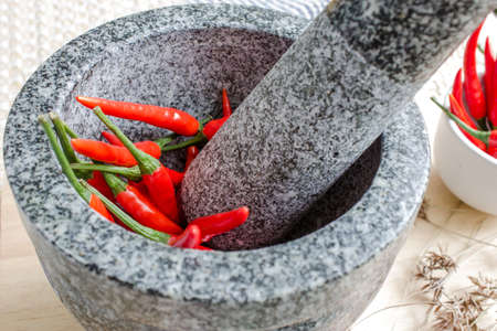 Cook crushing a blending red pepper in a wooden pestle and mortar in a close up view on his hands. Cooking a national dish in the kitchen.