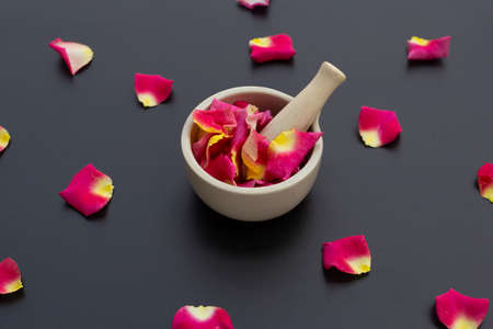Rose petals in porcelain mortar with pestle isolated on dark background.