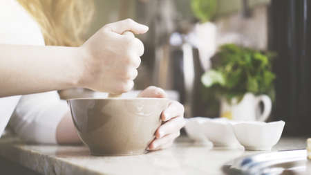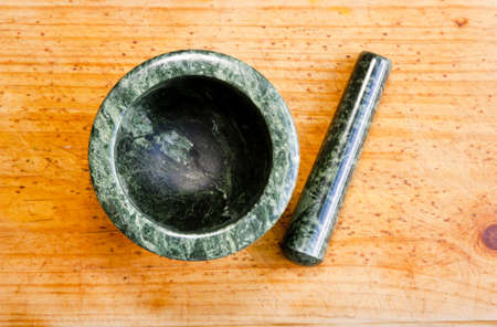 Granite mortar standing on kitchen table and woman hands. Kitchen tool in close up.