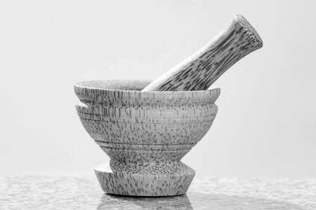 Granite gray mortar with pestle on a gray wooden table background with pepper. Stone mortar is an important tool in cooking pepper food