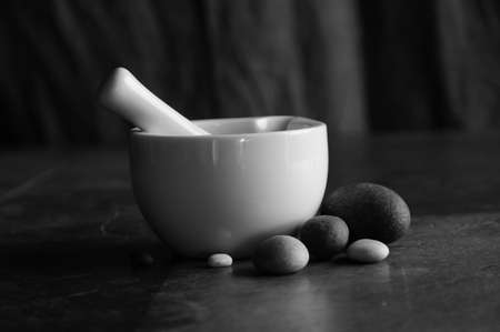 Extreme close-up macro photograph of a pharmacist's mortar and pestle resting beside a small collect