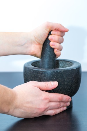Professional pharmacist grinding a medical preparation using a mortar and pestle, pharmacy and medicine concept, hands close up