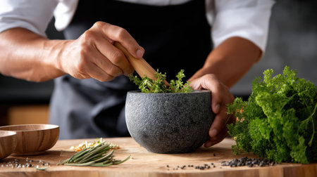 A chef is preparing a dish with herbs and spices. Scene is focused and determined as the chef carefully measures and mixes the ingredients