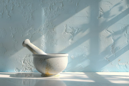 A white mortar and pestle set rests on a vibrant blue background, highlighting its smooth design. This tool is essential for grinding herbs and spices in culinary and medicinal practices.