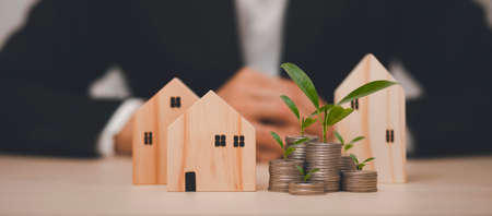 Businessman with house model and piles of coins.Realtor, mortgage, saving money, home loan concept.