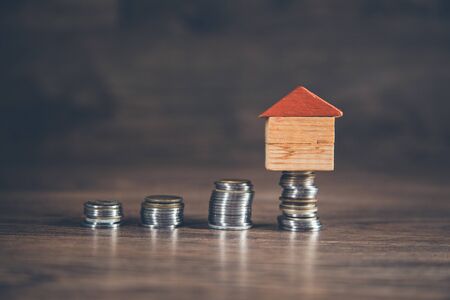 House and coin placed on the table as a ladder represent interest rates. Concept of investment real estate, risks and market uncertainty. Coin savings planning to buy home.