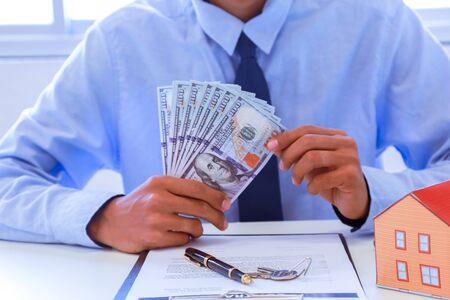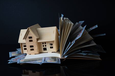 house property mortgage with cash money dollar bill on table concept of business finance, saving for buy home, investment loan, american currency, sale estate, bank payment, sell-rent real estate