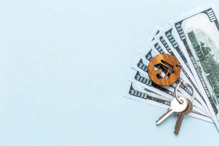 Home key with a keychain on a stack of $ 100 bills on yellow background. Purchase of an apartment, house, real estate, business, mortgage and housing loan from bank, savings, cash, moving. Copy space