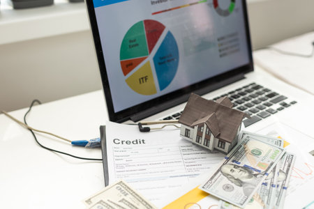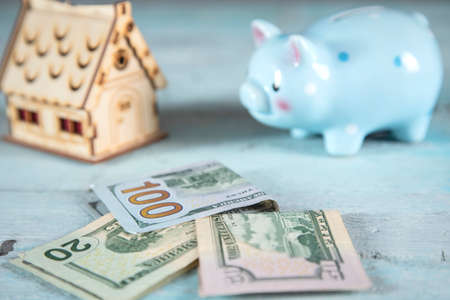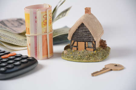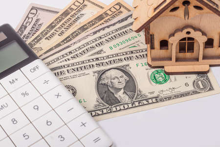 money, dollars, white calculator, toy house concept of buying and maintaining a house, apartment, credit relations, loan0,